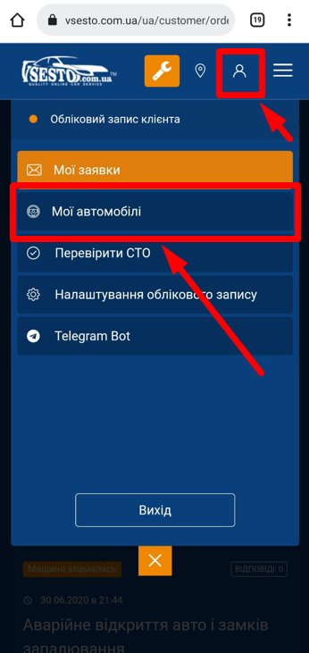 Натисканням на іконку "Чоловічка" - для Вас відкриється меню налаштування та управління особистим аккаунтом. Натисніть клавішу "Мої автомобілі"